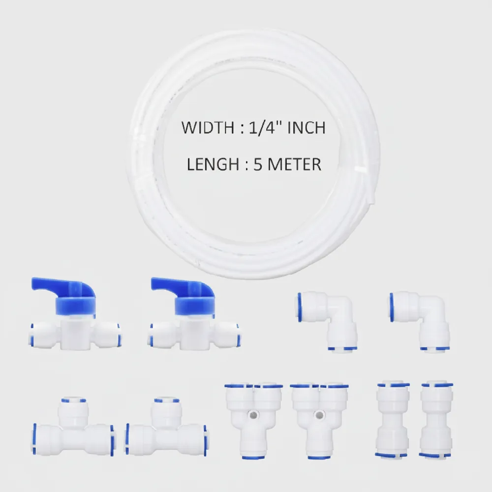 Simplify your water purifier installation or repair with this versatile Water Purifier Tube Fittings & Hose Kit. Designed for universal compatibility, this set is the ultimate solution for setting up, extending, or maintaining any Reverse Osmosis (RO) system, UV purifier, or fridge water dispenser that utilizes standard 1/4-inch piping.